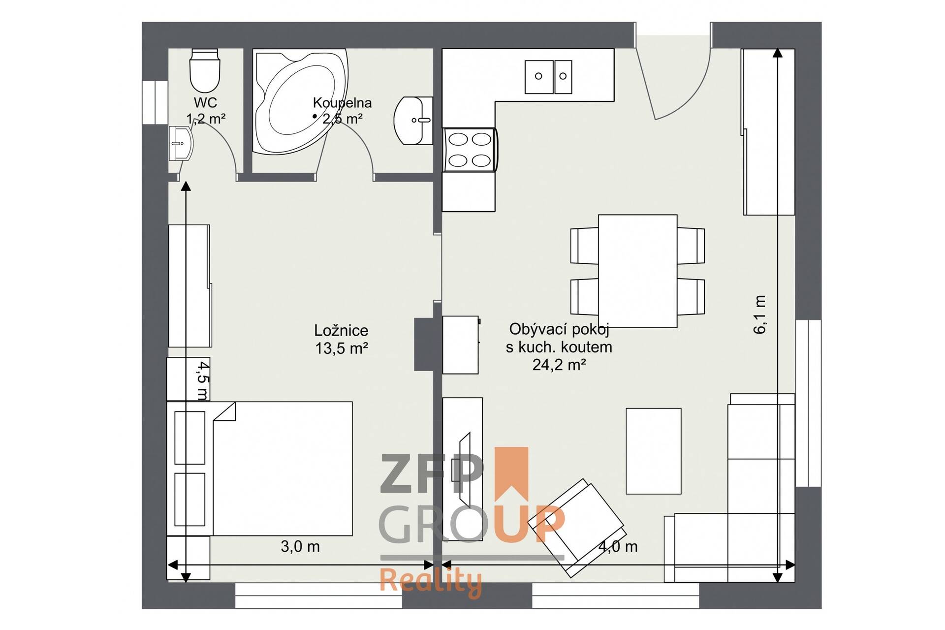 Jedná se o byt dispozice 2+kk s koupelnou a samostatnou toaletou. Byt má vstup společnou předsíní s vedlejším bytem, kde mají oba byty společnou, ale rozdělenou velkou šatní skříň. Jedná se tedy o soužití s rodinou ve společném domě v samostatných bytových jednotkách. Byt se nachází v přízemí a orientace oken je na jih a západ. Jedná se o velice klidnou lokalitu Horních Počernic, slepou ulici Zdoňovskou.