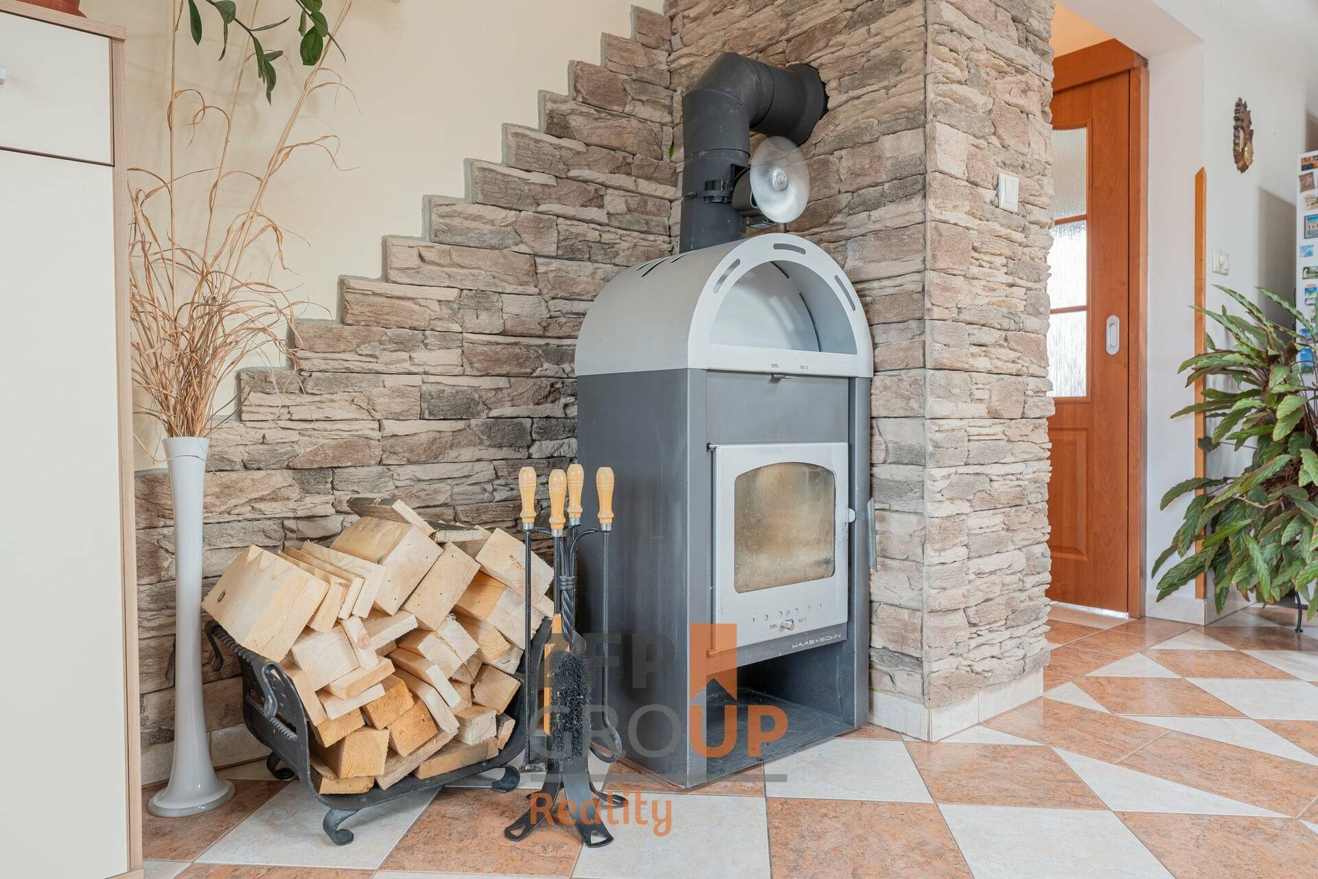 - prostorný obývací pokoj s krbovými kamny 24 m2 a přímým vstupem na zahradu