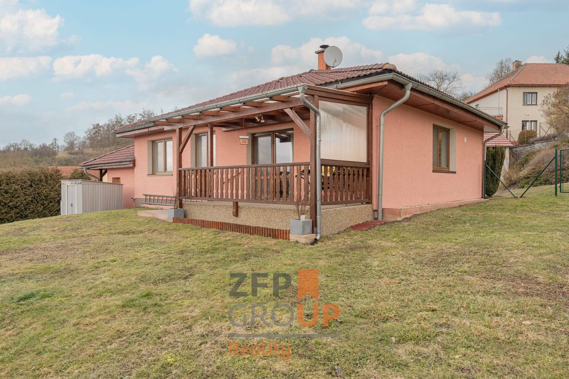 Součástí domu je také garáž a zastřešené parkovací stání pro dvě auta, umístěné přímo u domu. Pozemek o výměře 910 m² tvoří pečlivě udržovaná okrasná zahrada, která poskytuje dostatek soukromí i prostoru pro odpočinek. Za domem se nachází přístřešek s posezením, odkud je krásný výhled - ideální místo pro relaxaci, rodinné stolování nebo letní večery. Dům nabízí praktické a funkční uspořádání vhodné pro rodinu i pár, který preferuje komfortní přízemní bydlení.