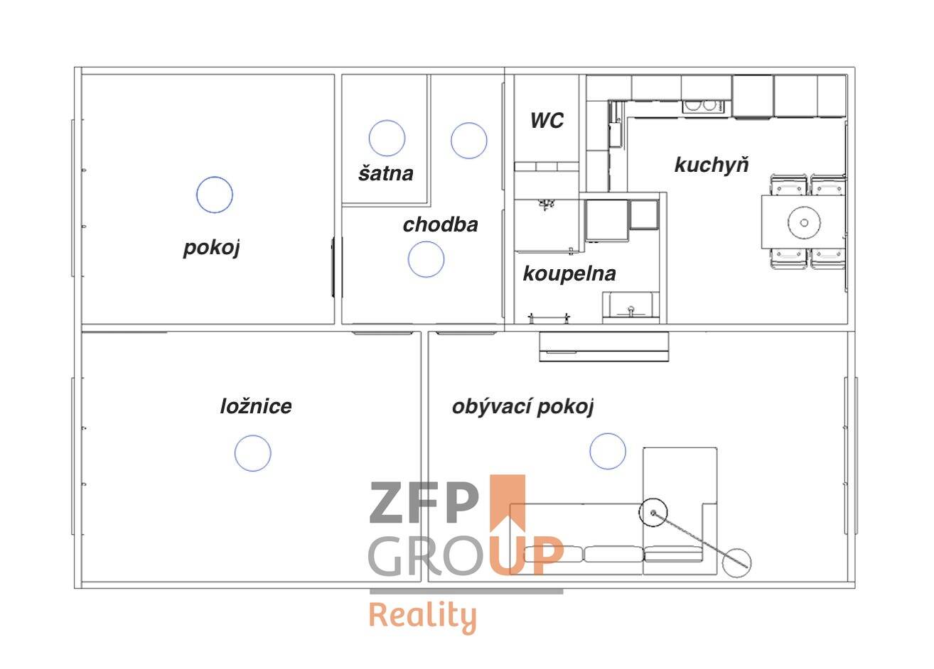 • obývací pokoj se sedací soupravou a úložnou skříní