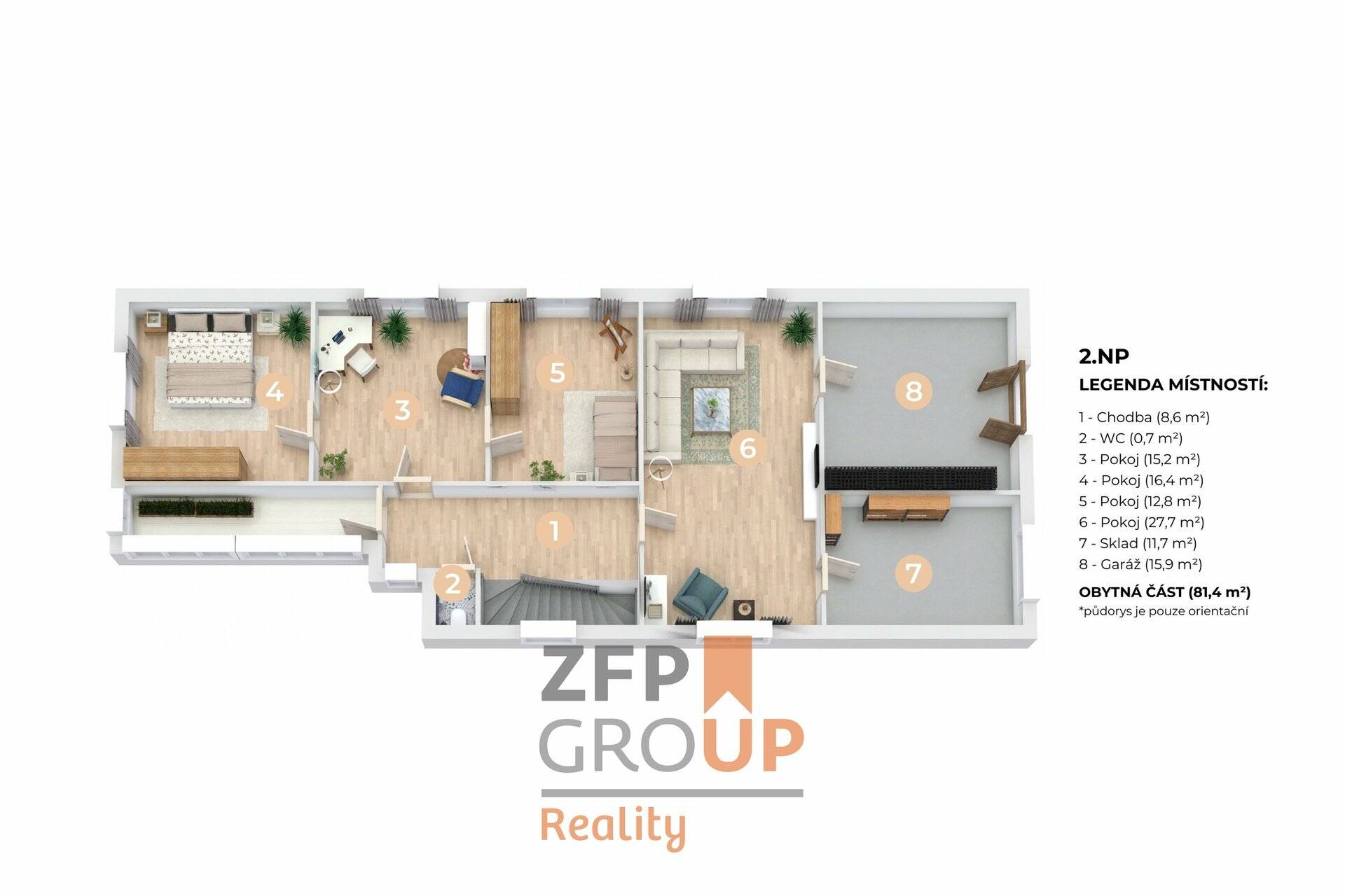 Patro: Ve druhém podlaží se nachází čtyři obytné místnosti, chodba a toaleta. Velkou výhodou je přímý vstup do garáže, ze které se dostanete na dvůr v zadní části nemovitosti, kde je k dispozici další parkovací místo.