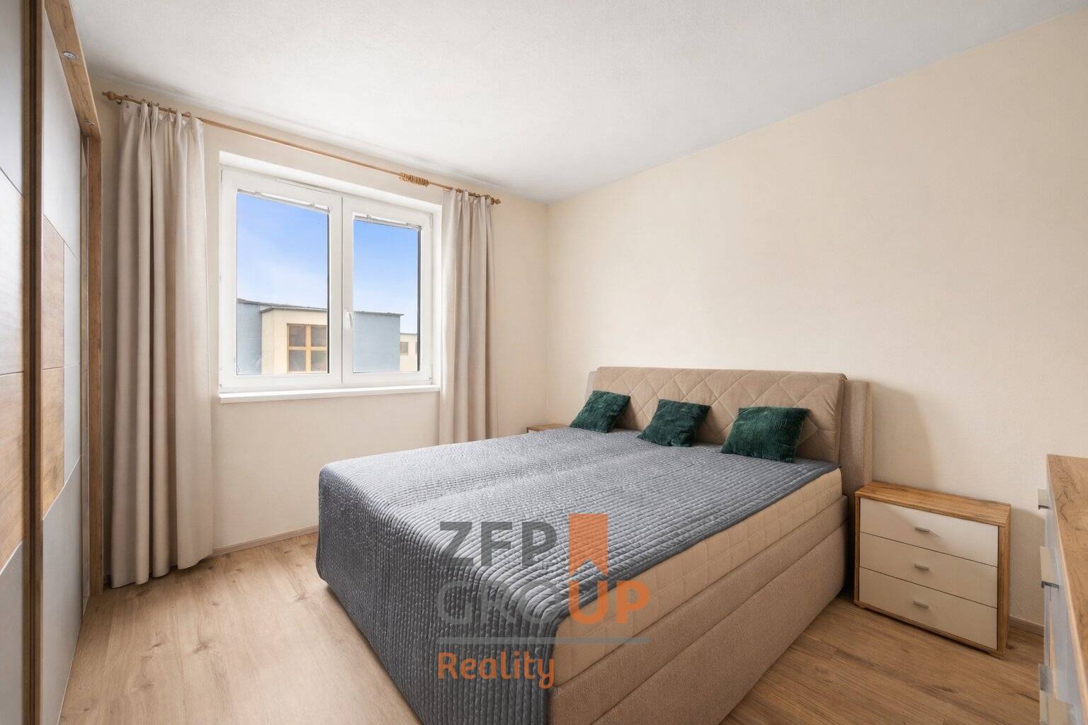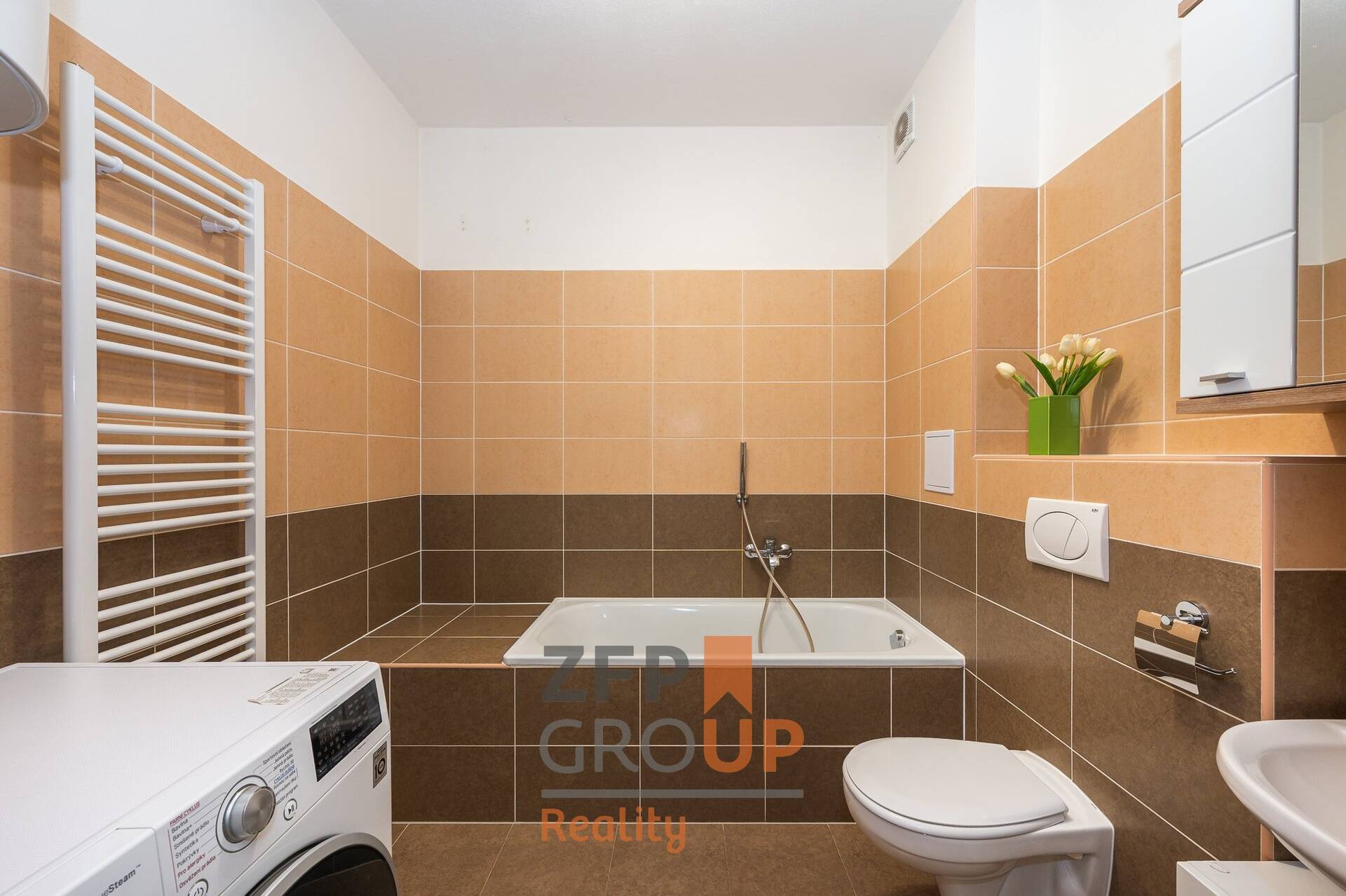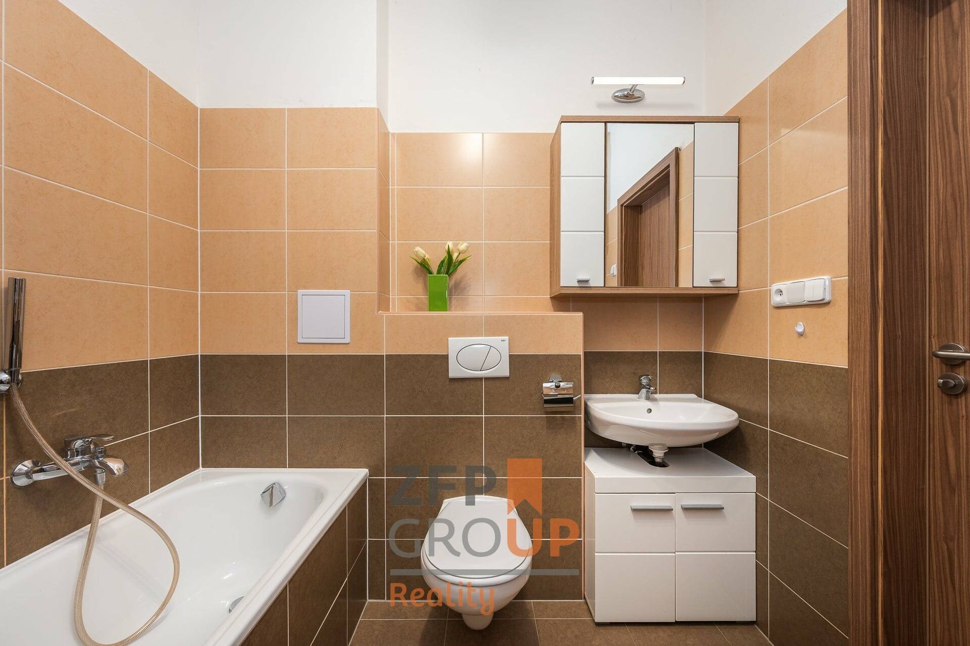 Samostatná ložnice (13,32 m²) nabízí dost prostoru pro manželskou postel i úložné řešení. Koupelna je vybavena vanou, WC a umyvadlem, zároveň je zde místo pro pračku.