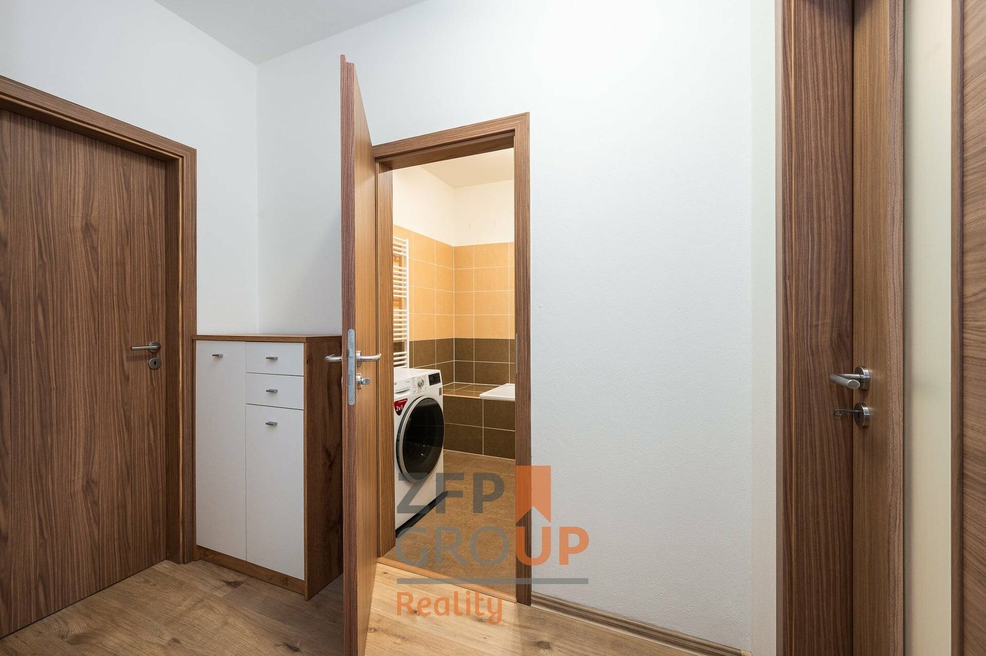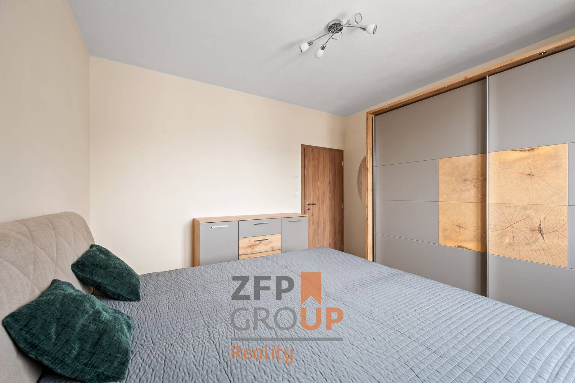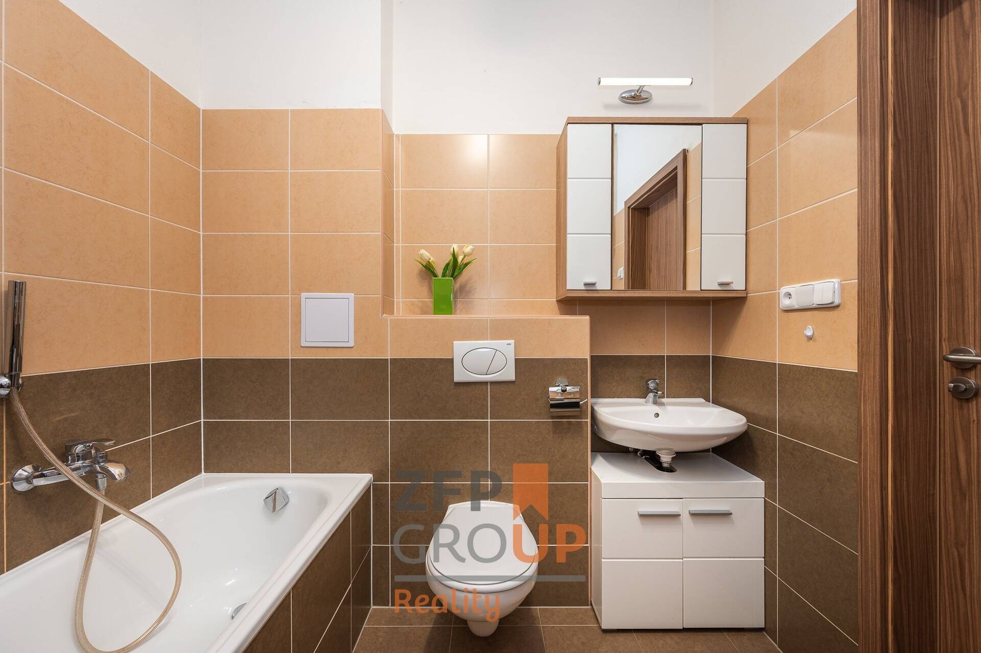 Samostatná ložnice (13,32 m²) nabízí dost prostoru pro manželskou postel i úložné řešení. Koupelna je vybavena vanou, WC a umyvadlem, zároveň je zde místo pro pračku.