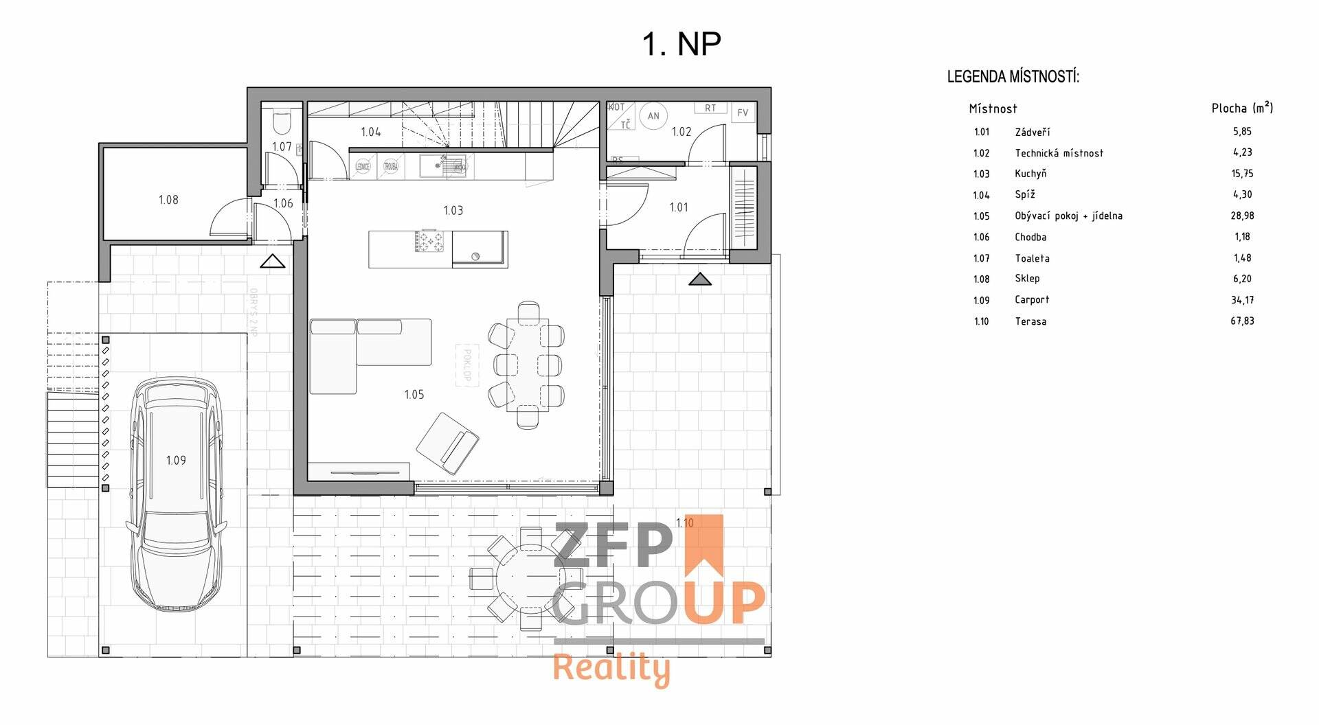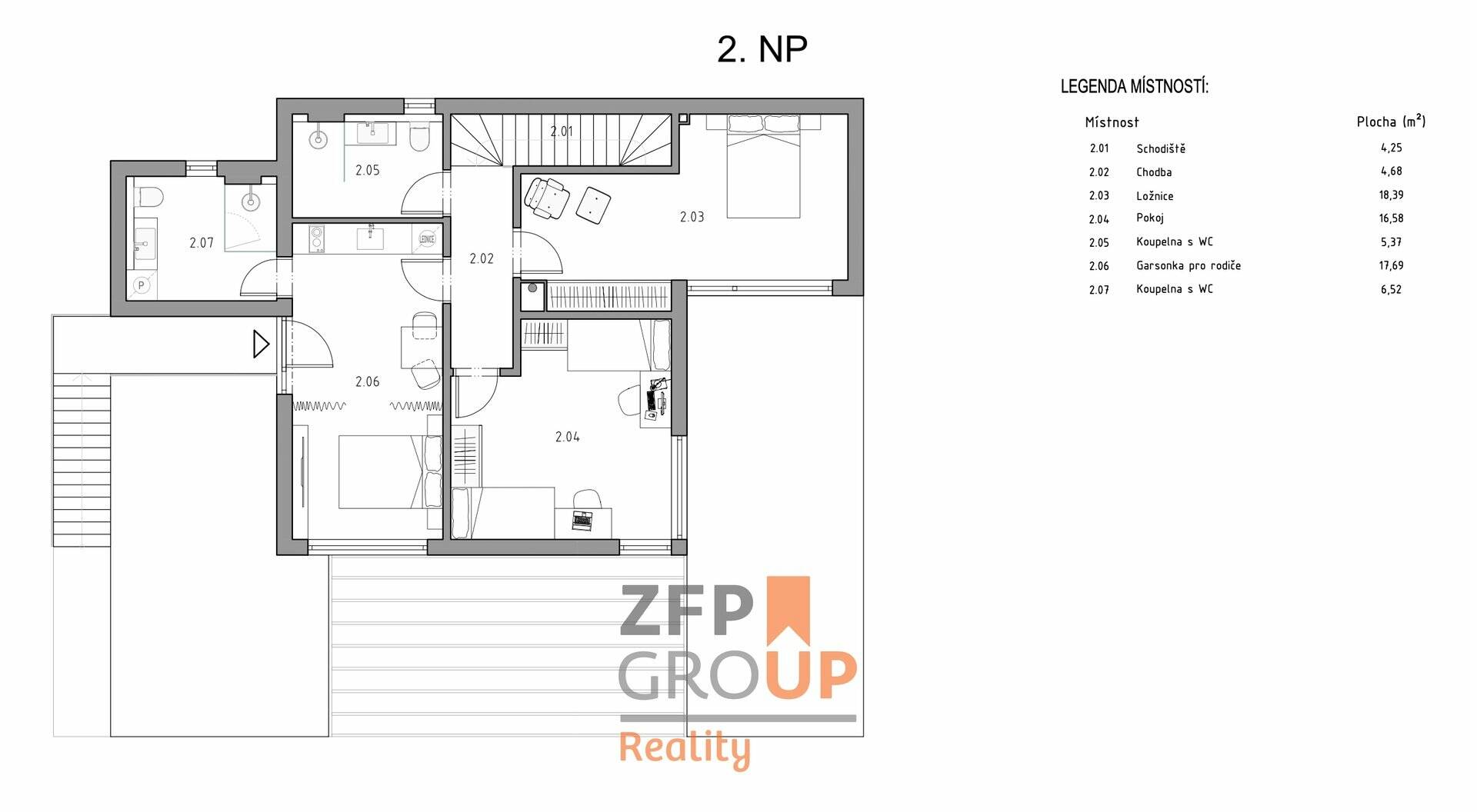 Dvoupatrový se sedlovou střechouZastavěná plocha: 92 m2Celková užitná plocha: 141 m2 + terasa 67 m2Dispozice: 4+kkSociální zázemí: v 1. NP samostatná toaleta, ve 2. NP dvě koupelny s toaletou