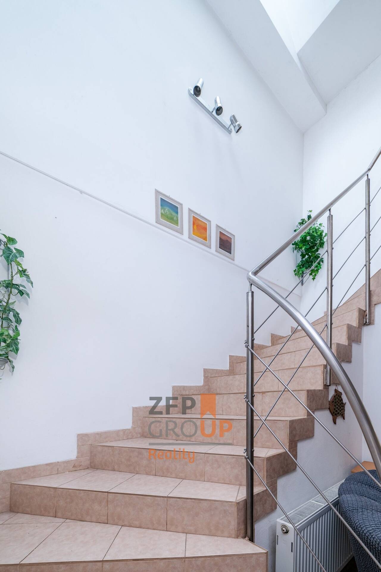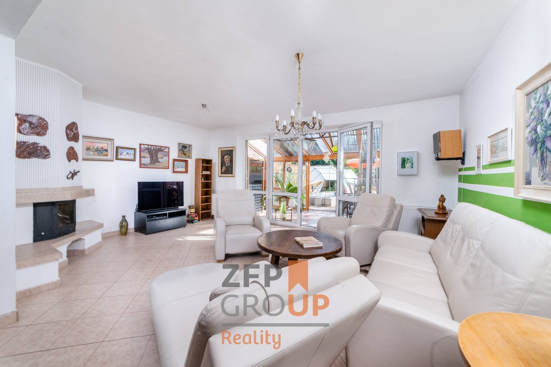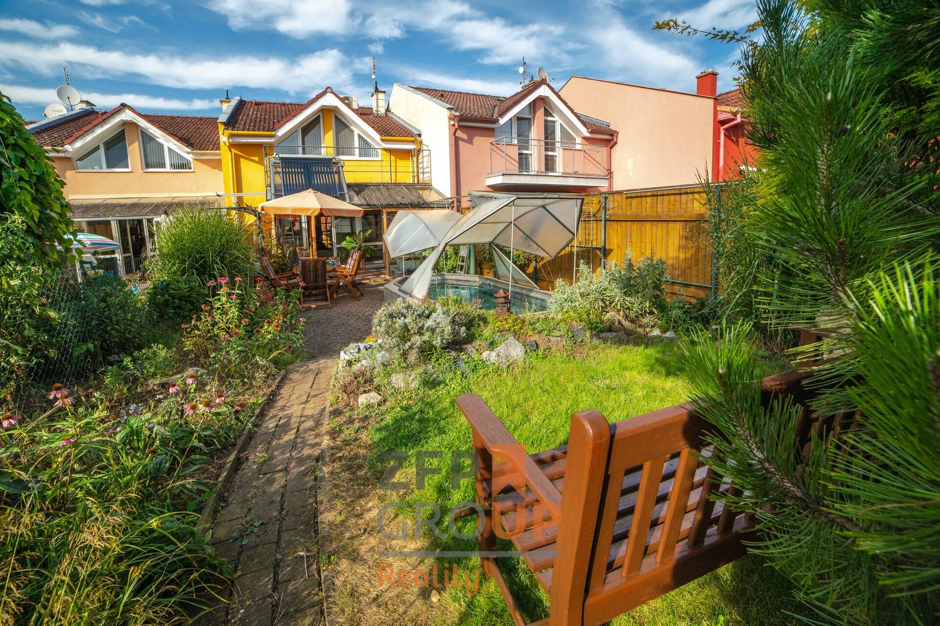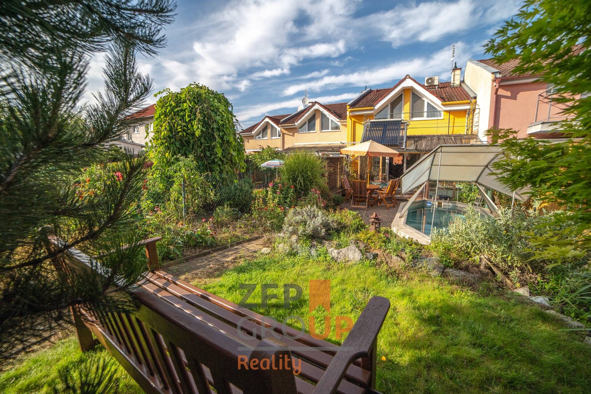 Dvoupodlažní dům o výměře 185 m2 disponuje při vstupu předsíní a místností s toaletou. Následuje spodní část domu, kde se nachází obývací pokoj vybavený krbem, kuchyňským koutem a zimní zahradou s nainstalovaným solárním panelem pro ohřev vody. Na malebné zahradě o rozloze 120 m2 je zbudován zastřešený bazén v nerezu.