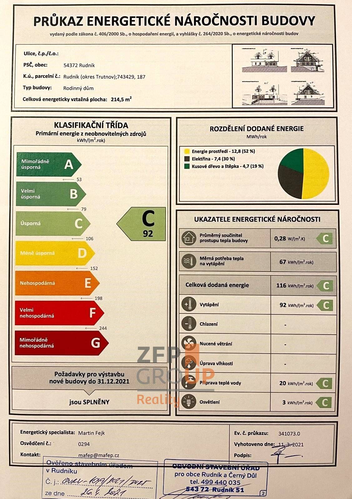 Dům má přivedenu přípojku vody z veřejného vodovodu, odpad bude řešen ČOV a samozřejmě je zde přípojka elektřiny. K celé stavbě je projektová dokumentace a PENB. Zastavěná plocha je 130 m2 a celková plocha parcely je 1160 m2. Obec a SÚ souhlasí s další výstavbou na vedlejší parcele, která může být též předmětem prodeje.