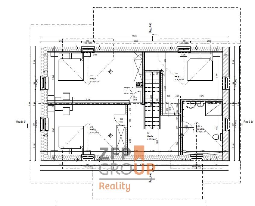 Další podlaží 2.NP nabízí svojí velikostí dostatek místa na další tři pokoje a velkou koupelnu. Výškově se zde vejde malé třetí patro nebo dostatek úložného prostoru.