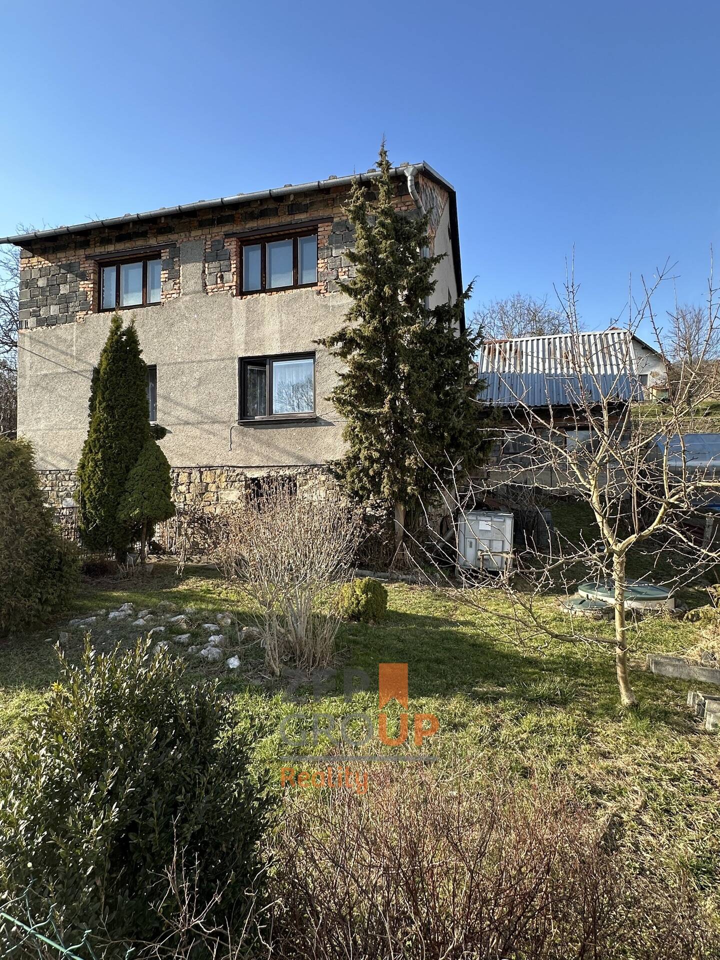 Dům je podsklepený, součástí stavby je garáž umístěná vedle sklepa. Na pozemku za domem se dále nachází praktická kůlna a kryté posezení.