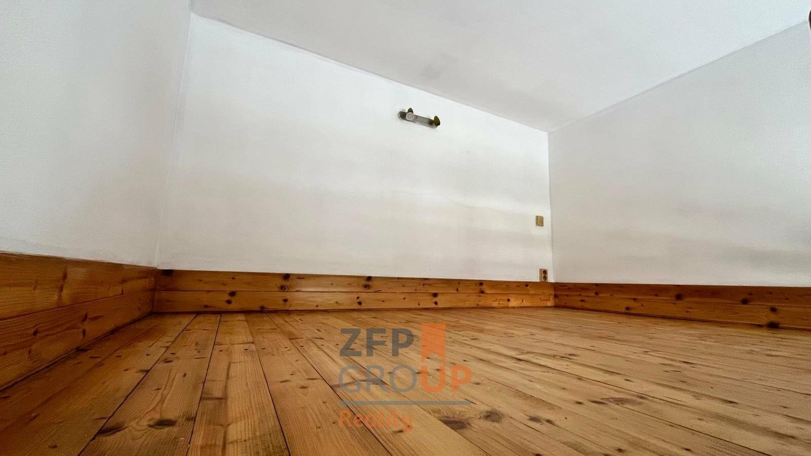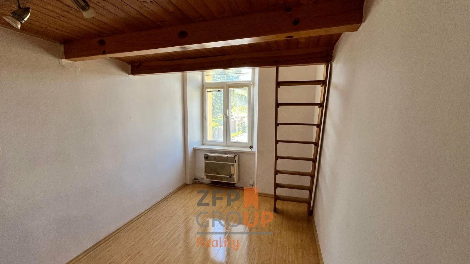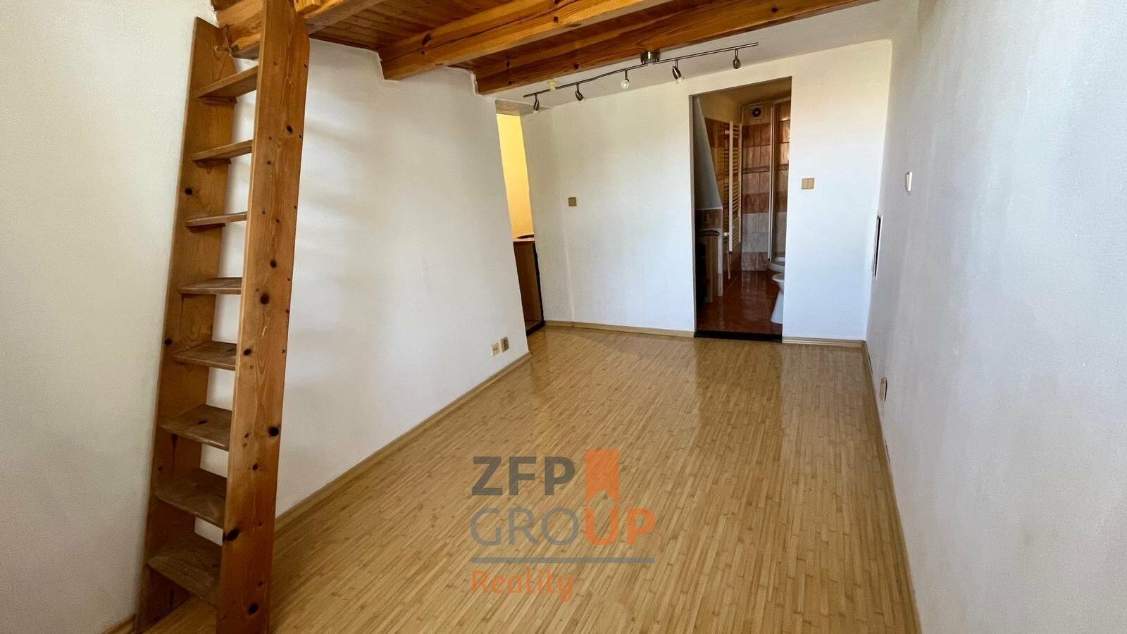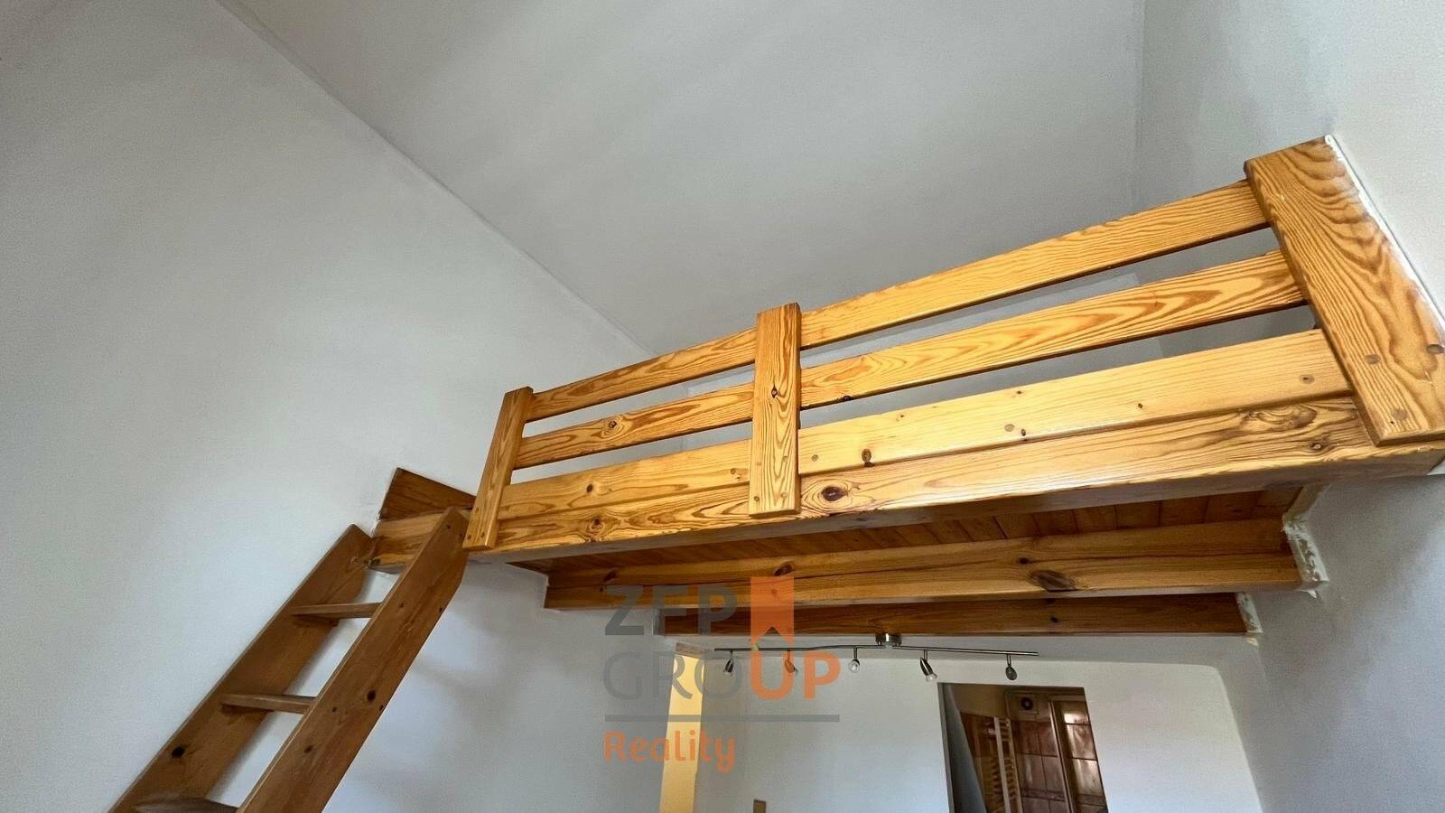 Dispozice bytu je prakticky řešena – obytný prostor s kuchyňským koutem a vyvýšeným spaním v mezonetu (dřevěné patro na spaní), což šetří místo a odděluje klidovou část.