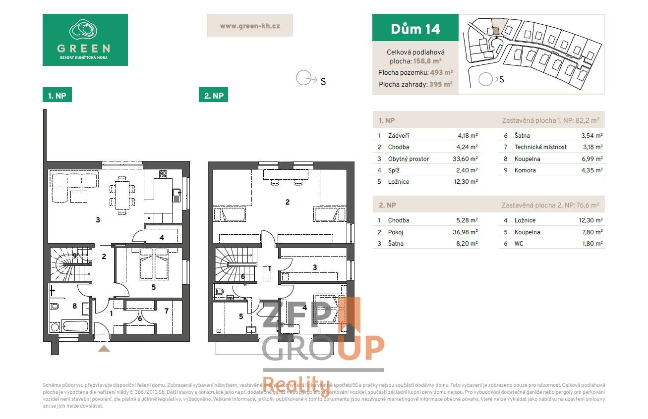 Zastavěná plocha domu je 98 m2, užitná plocha 1.NP je 82 m2, druhého 76 m2, plocha zahrady je 395 m2.
