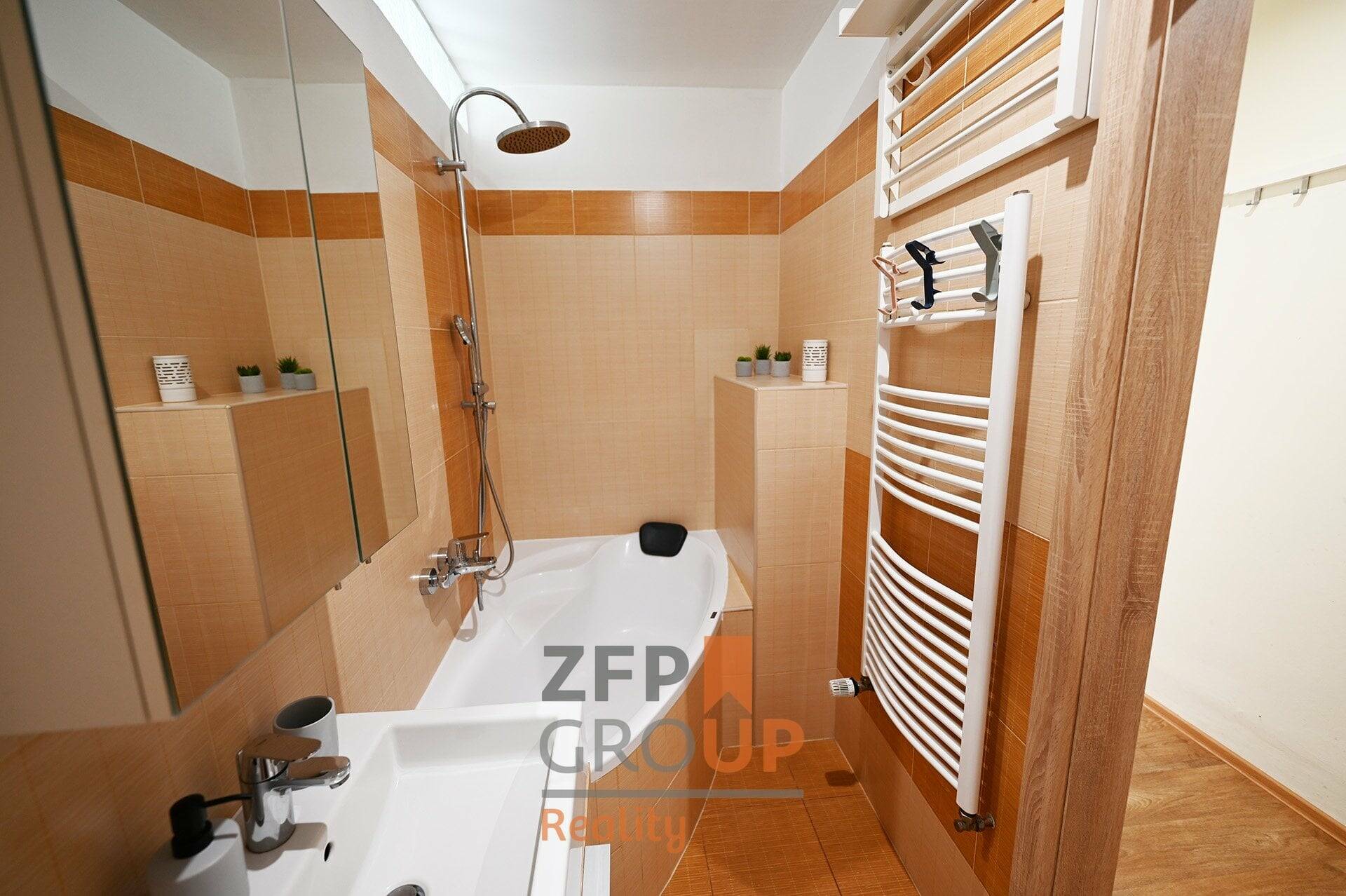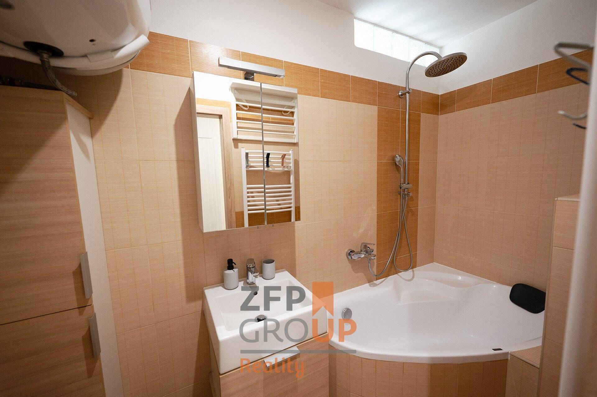 - Moderní koupelna s rohovou vanou, sprchou a bojlerem (150 l)