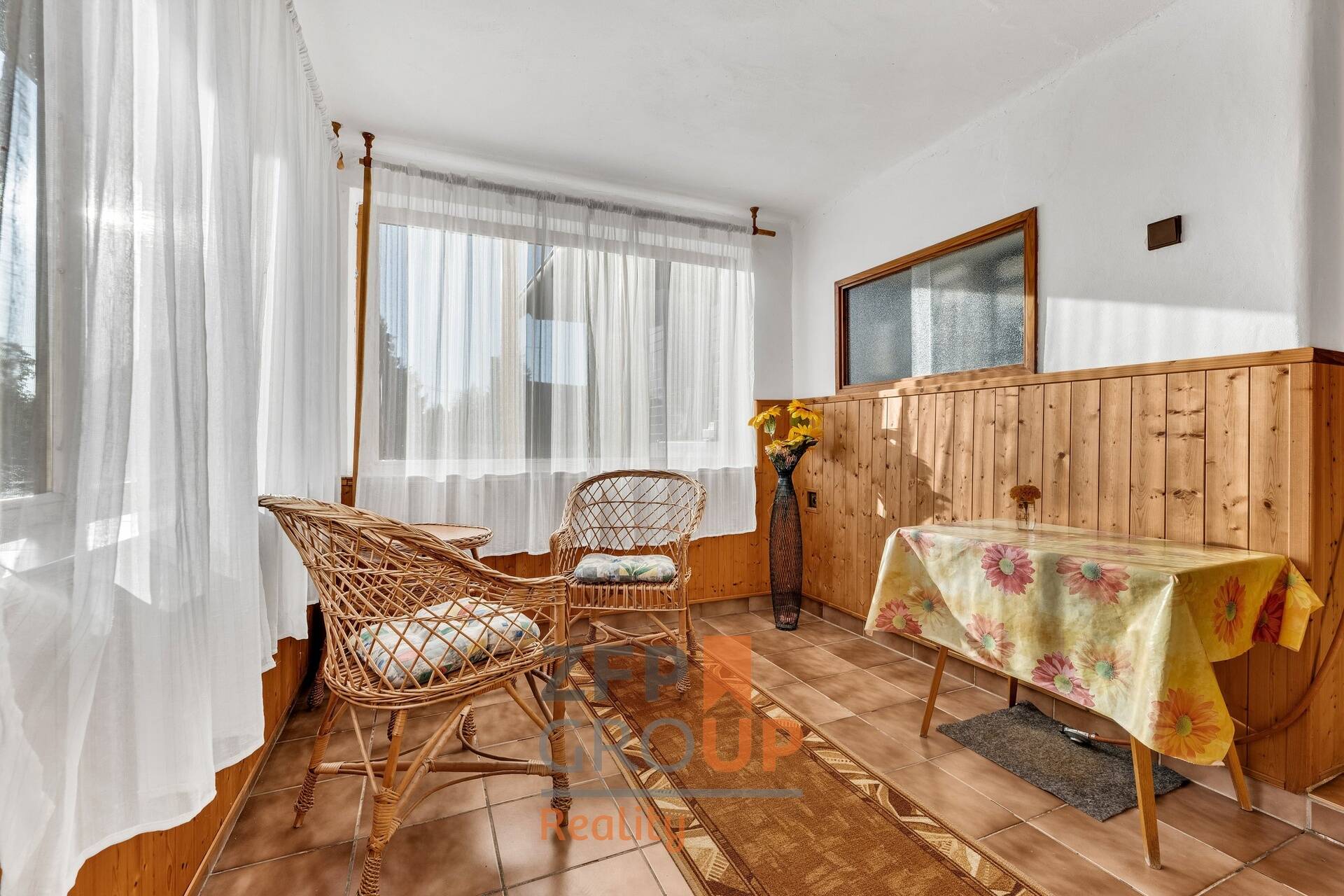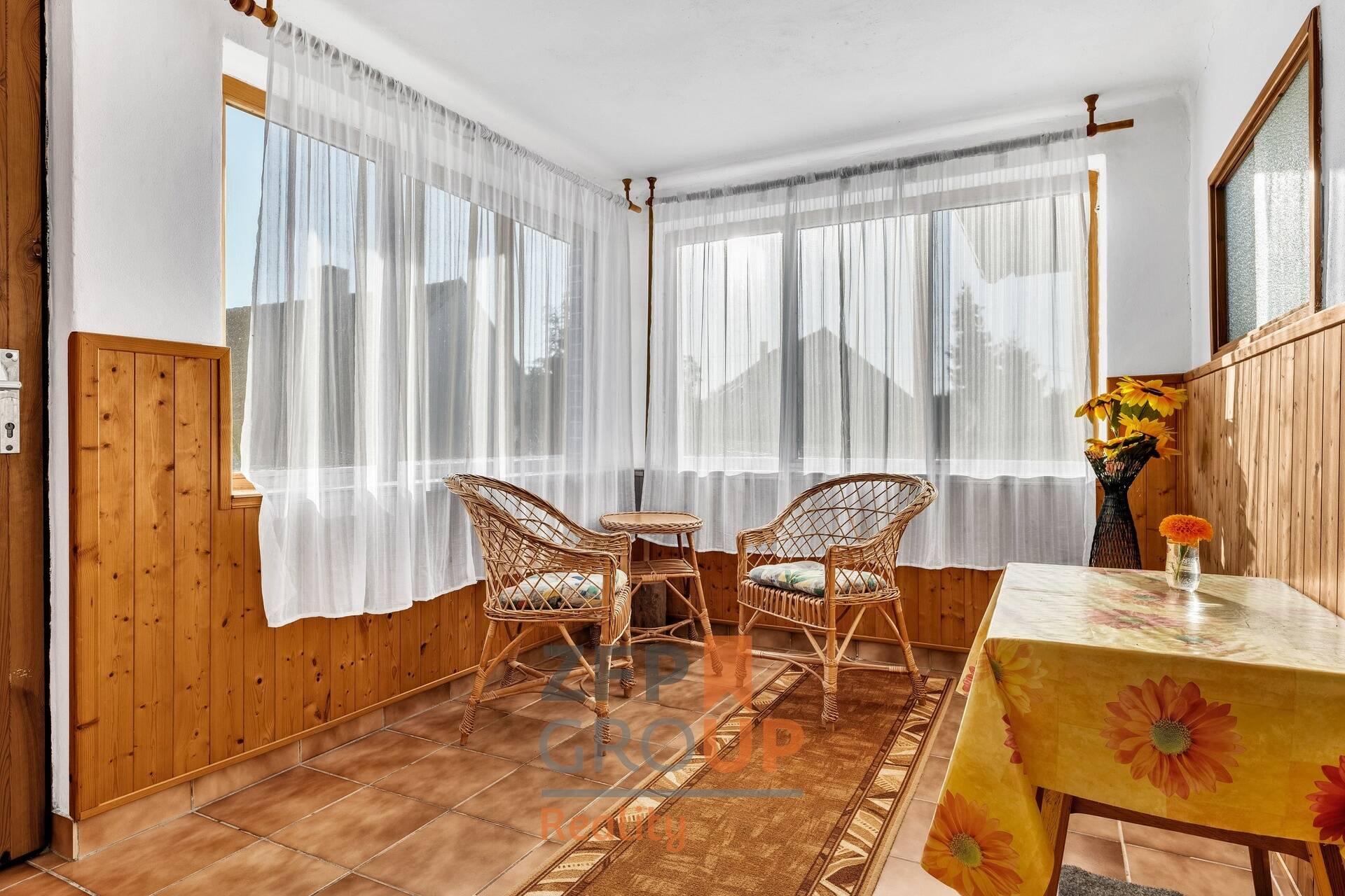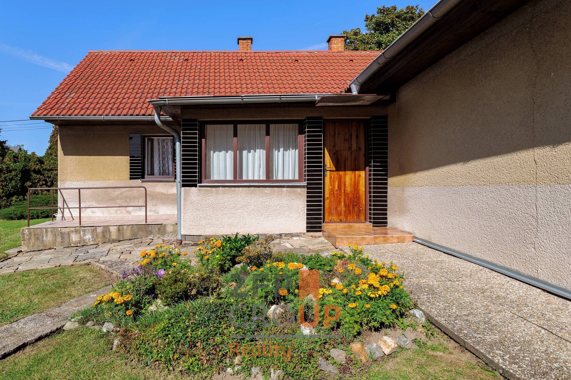 - Vstup přes zastřešenou verandu s výhledem do zahrady.