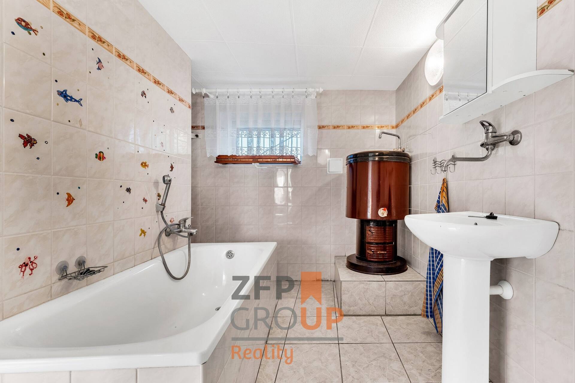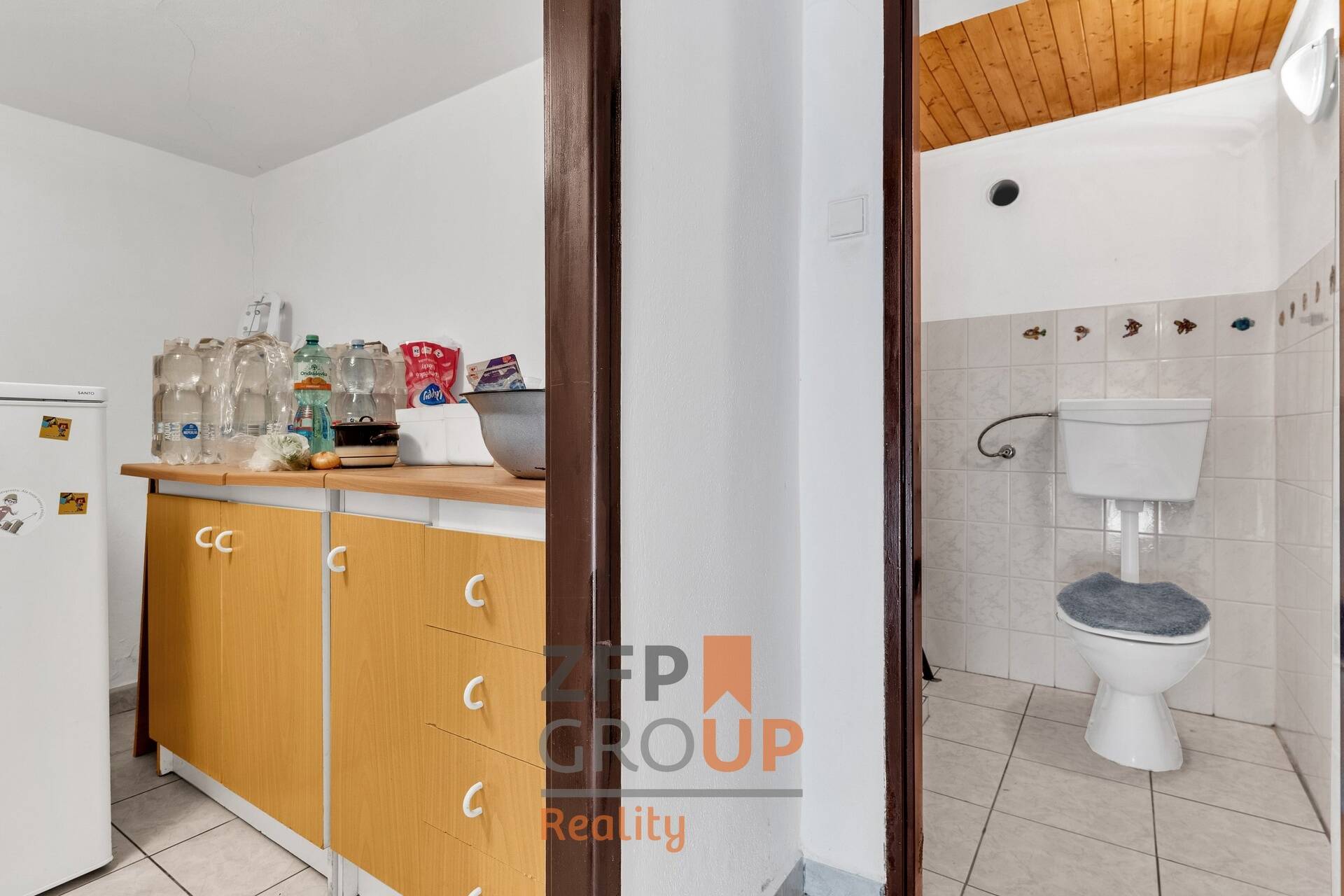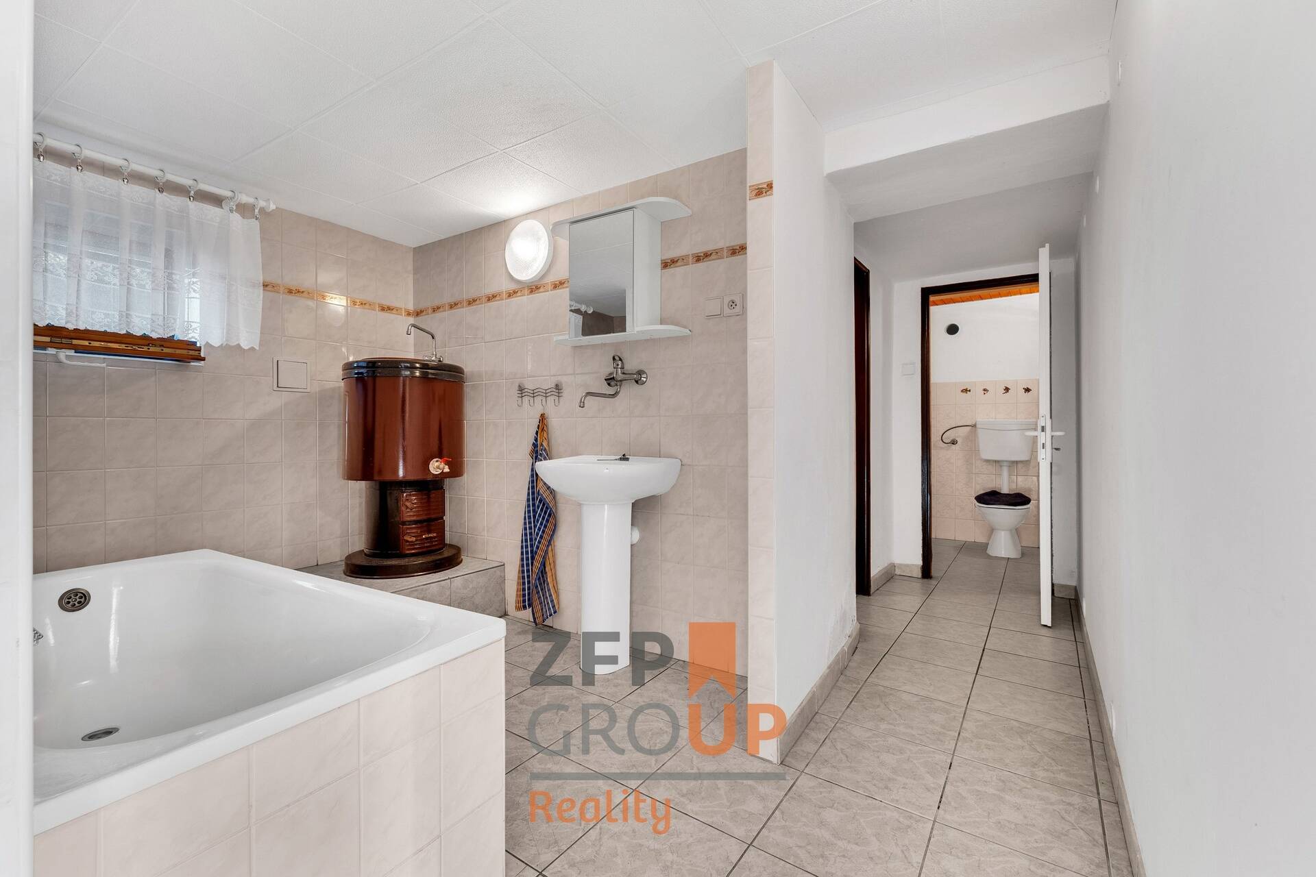 - Koupelna s vanou, průchozí do místnosti využívané jako spíž; samostatná toaleta vedle.