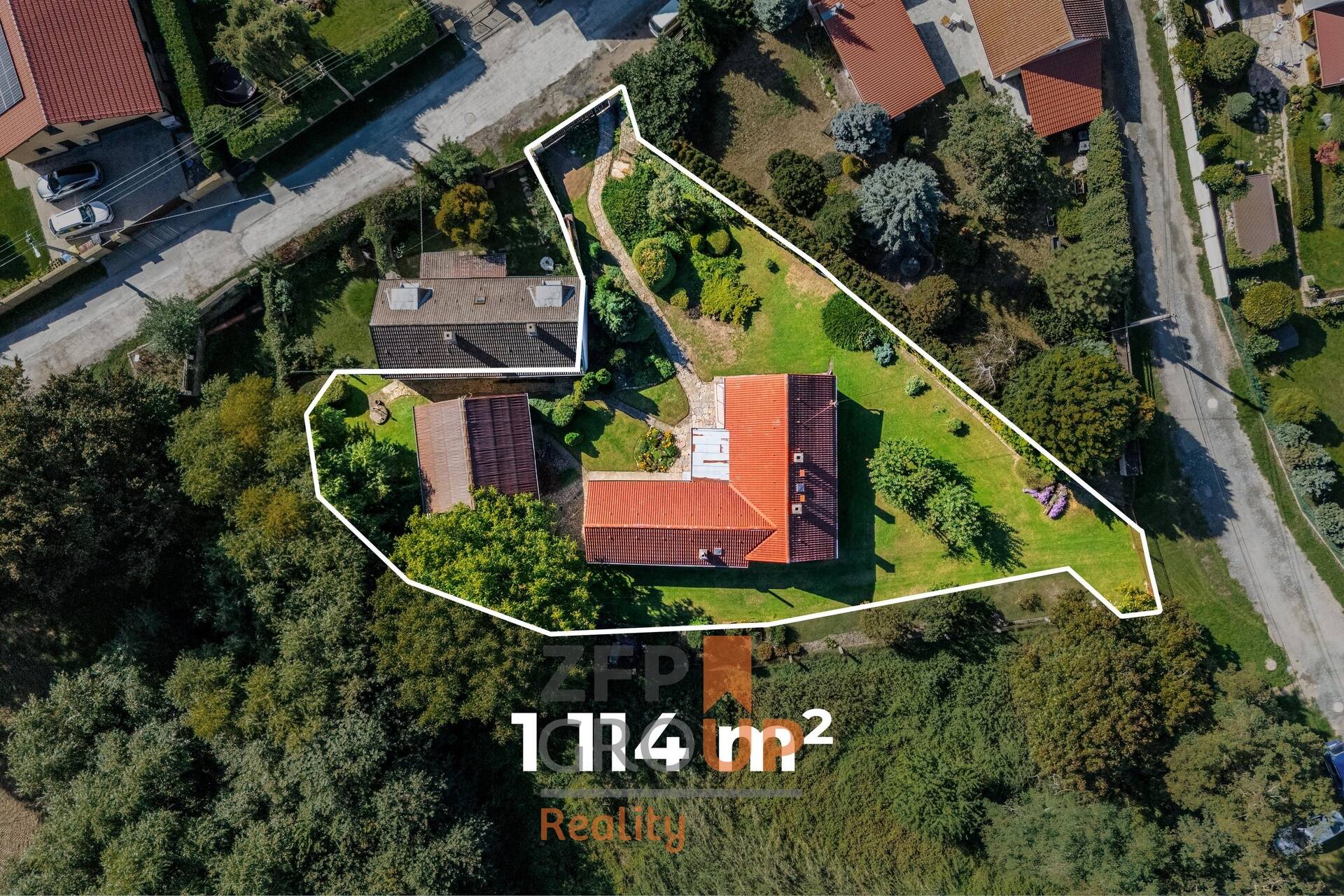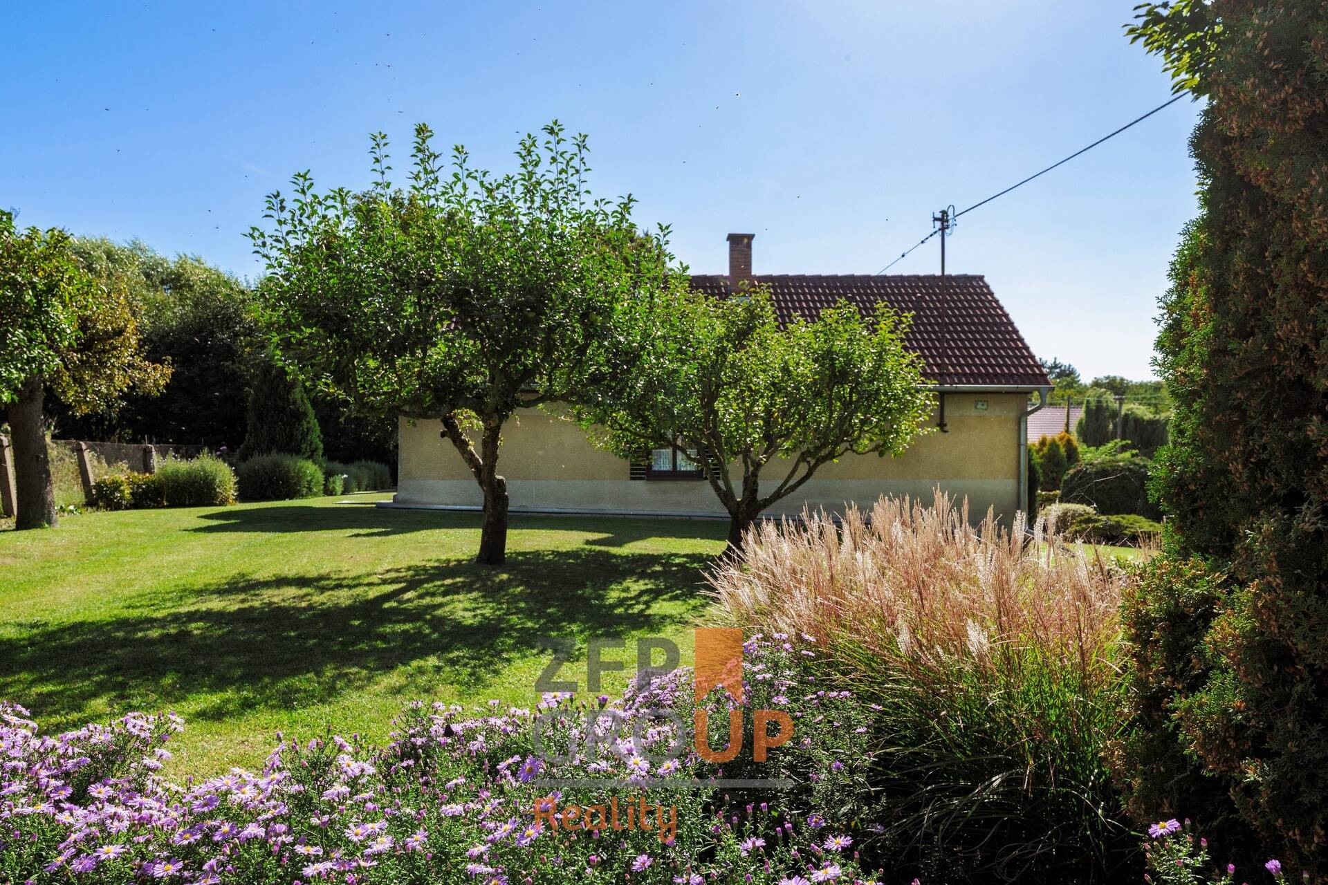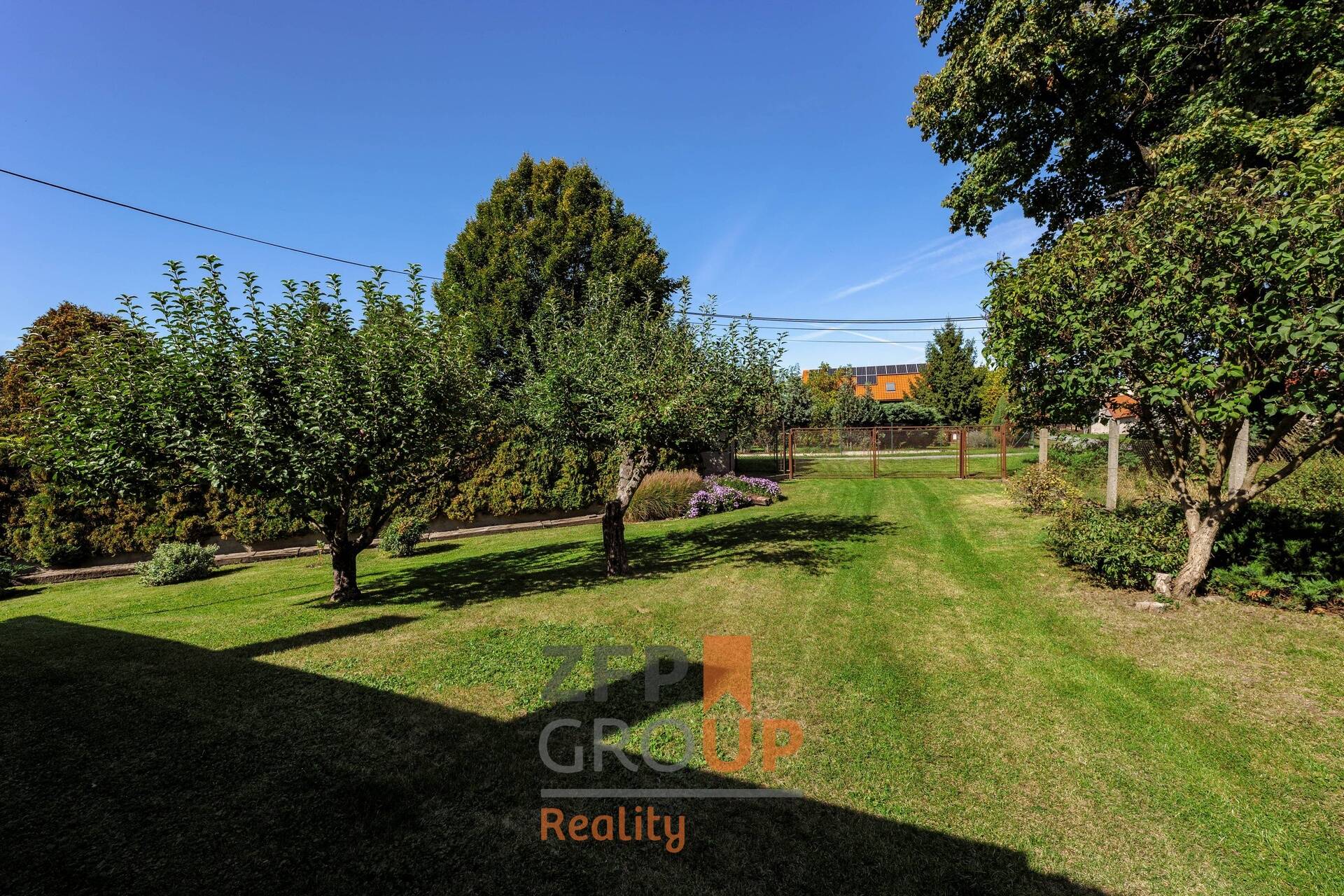 - Upravovaná zahrada s výrazným ořechem a několika jabloněmi.