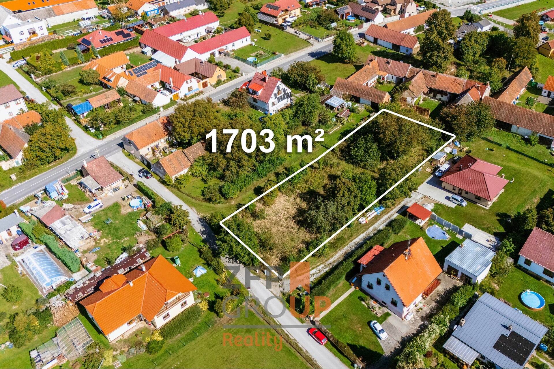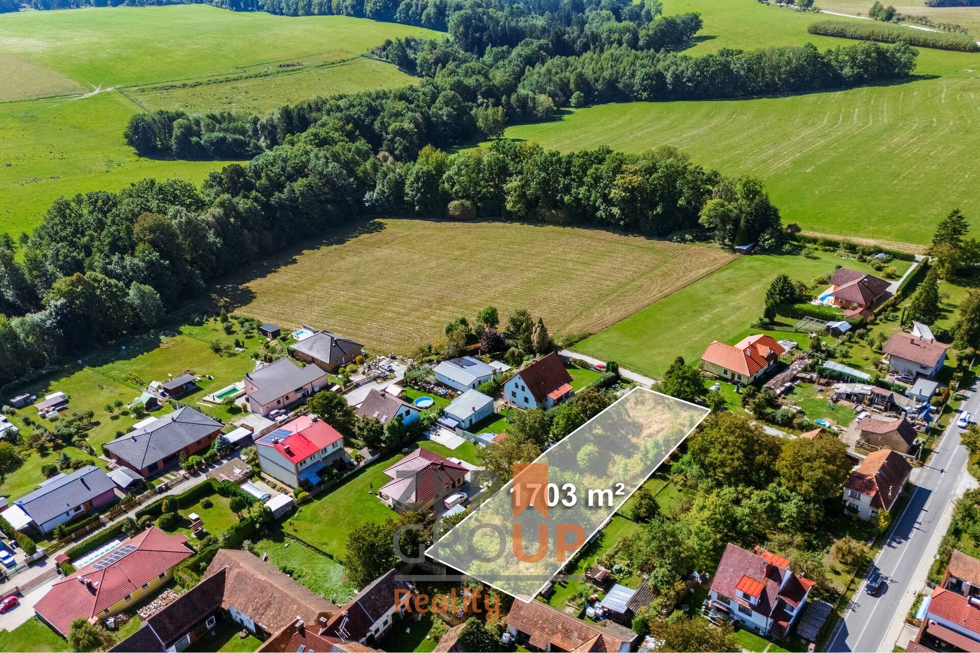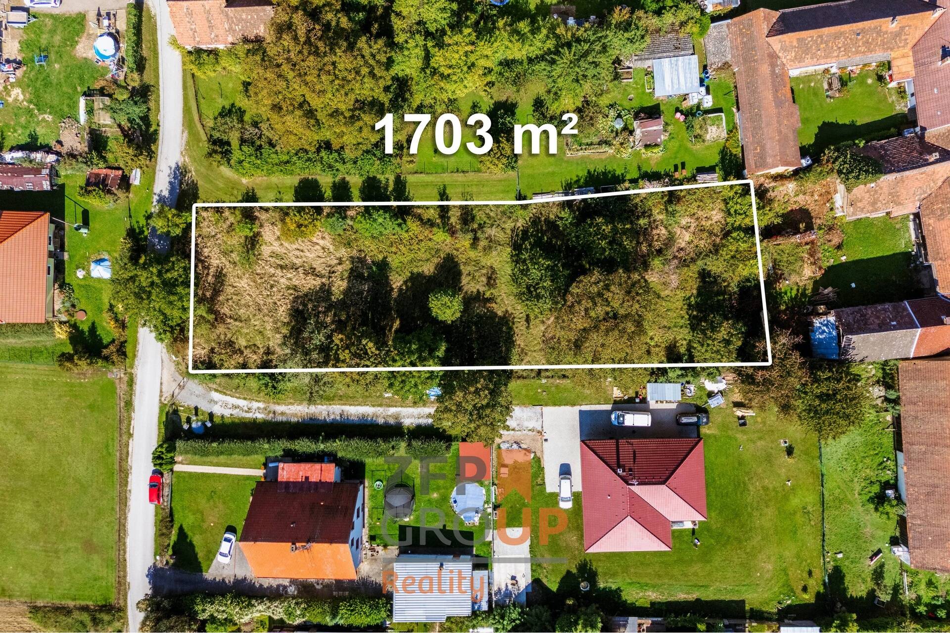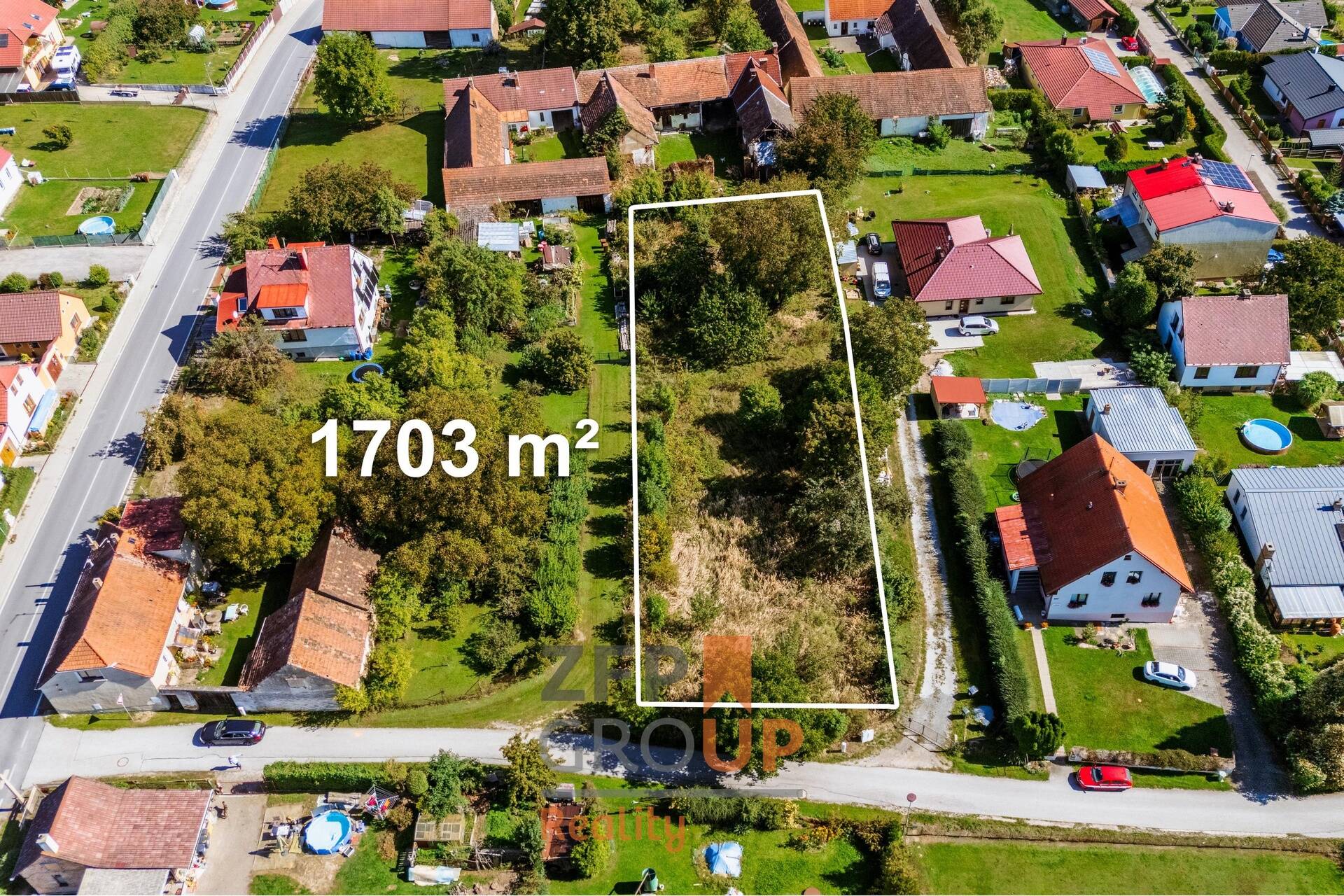 • Velkorysá plocha 1 703 m² – pohodlné osazení RD, zahrada, zázemí